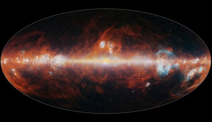این تصویر شگفتانگیز همه اجزای کیهان را به نمایش میگذارد؛ از گرد و غبار کیهانی قرمز سوخته گرفته تا گاز هیدروژن آبی و ستارههای سفید، آبی و سبز. چشمانداز پانورامای سهبعدی با بهرهگیری از طول موجهای مادون قرمز نور ثبت شده است، طول موجهایی که برای چشم انسان نامرئی هستند و طیف وسیعی از رنگها را آشکار میکنند.
